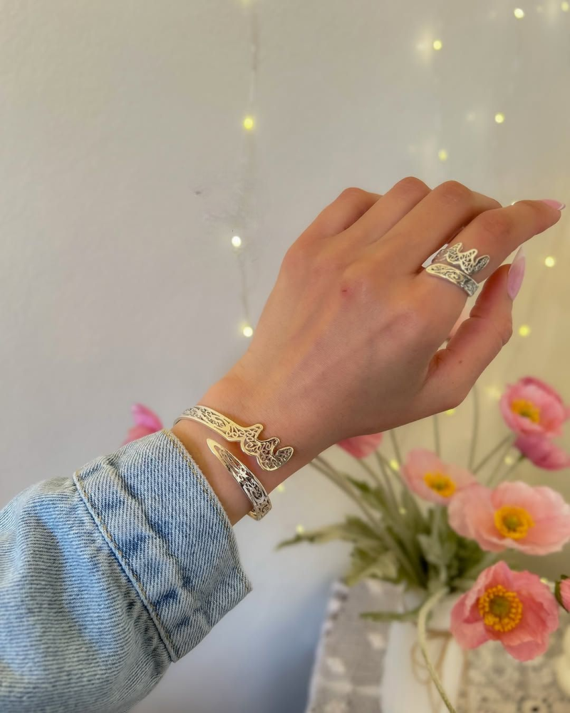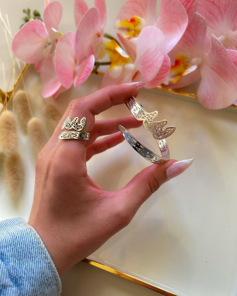 بكج مميزه جدا بتصميم الحرف العربي ، مطلي بطلاء ذهب مع ضمان سنتين على اللون وطبعا مع علبة مخصصة وكيس.تصميم الحرف حسب الطلب.مطلي ذهب وفضة.ضمان ثابت على اللون.متوفر جميع وسائل الدفع الآمنة.